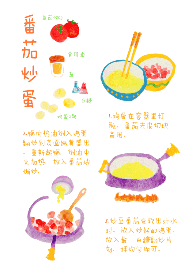 如果娃喜欢红色,多加一个番茄少一个蛋,喜欢黄色,多个鸡蛋少一点番茄。