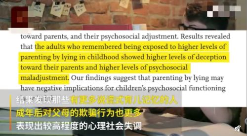 为了找出撒谎式育儿的弊端,研究人员找来了许多成年人进行问卷调查,让他们试图回忆小时候父母对自己说过的谎言,以及长大之后他们对父母说过的谎言。让人意想不到的是,研究结果证明,那些从小就接受撒谎式育儿的孩子,成年后对家长的欺骗行为也更多,具体表现为对父母不坦诚相待、掩饰自己的行踪以及人际关系等。