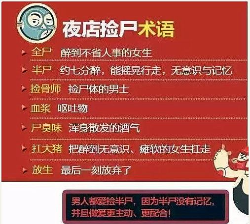 “捡尸”一词源于台湾,又叫“捡死鱼”,“捡醉虾”,指的是女孩子烂醉失去知觉而被男子捡走,发生性关系。尤其是好多高考刚结束去狂欢的小高三女生。偶尔也有男士被“捡尸”。国内有好多“捡尸群”,每天在群里刷榜晒战绩、排行榜,分享位置和技术、心得。