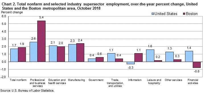 近些年,波士顿的经济保持着高于全国平均水平的势头发展。尤其是商业服务的工作增长率接近全国的两倍。教育和卫生服务是波士顿地区的支柱性产业,就业人数最多,工作增长率与全国平均水平持平。