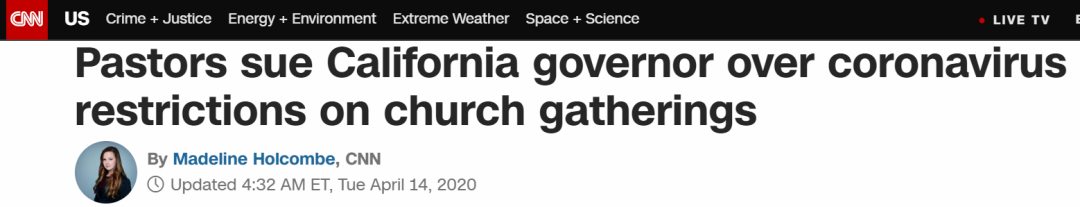 即便如此,美国还是有群众非常不满意居家隔离的政策。就在今早,CNN爆料加州某教堂牧师起诉了加利福尼亚州州长对人们去教堂礼拜的限制。