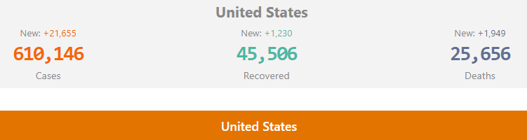 今天美国的疫情已经超过61万确诊,而死亡人数也已经高达25656人,单日死亡1,949人。