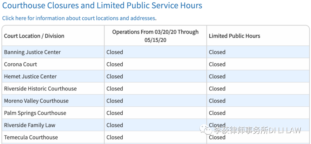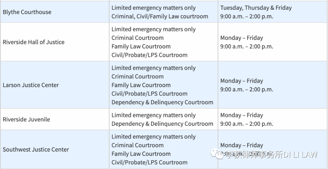 其他相关信息请见该法院官网:https://www.riverside.courts.ca.gov/PublicNotices/COVID-19-Court-Operations.php