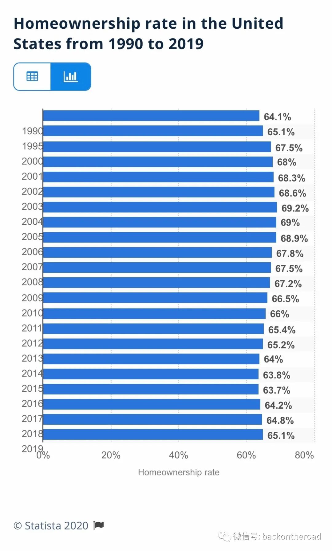 二战以后,罗斯福总统颁布了一些新政,其中包括提供房屋抵押贷款,提高房屋所有权,促进收入和财富的积累。下图显示,截至2019年美国平均房屋拥有率达到65.1%。