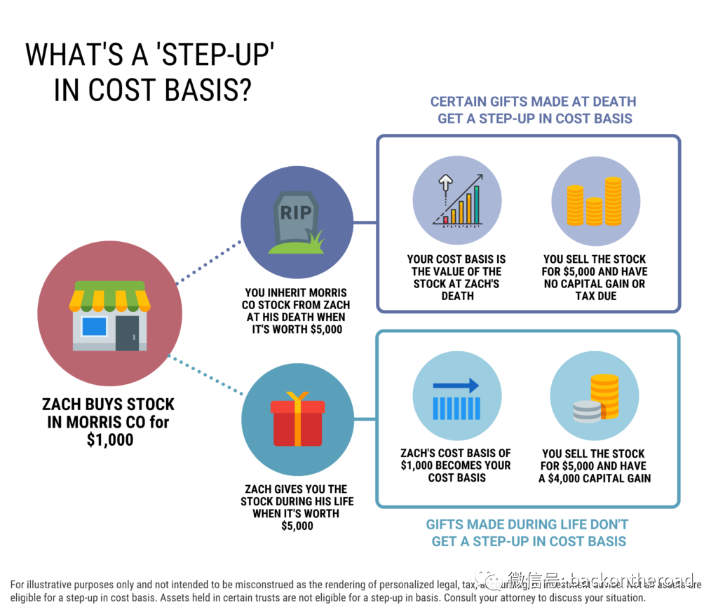 无论是房产还是金融资产,后代在继承遗产时,遗产的价值将根据继承时的市价(一般是递增的趋势)重新计算,作为继承者今后进行财产交易时征收资产增值税的一个新的起征点。
