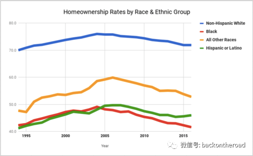 下图显示少数族裔在房屋拥有权方面明显低于白人。 但相对来说亚洲移民( 尤其是东亚移民)的平均收入已经超过白人,除去不动产和金融资产,还有很多中小企业的股权拥有。