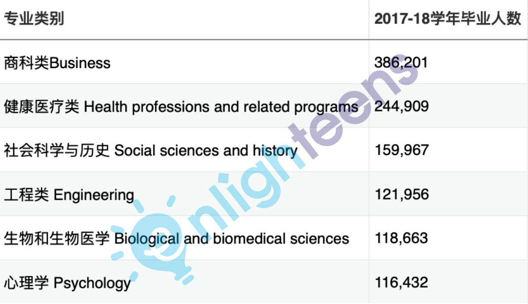 根据美国国家教育统计中心的最新数据统计,2017-2018学年授予的1,980,644个本科学位中,毕业人数超过100,000的大学专业有六个,它们分别是: