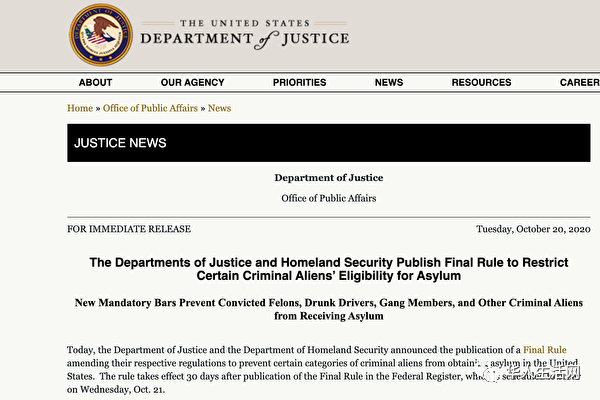 20日,美国司法部和国土安全部发布《最终规则》,对各自的法规进行修订,以防止某些犯罪类别的外国人在美国获得庇护资格。