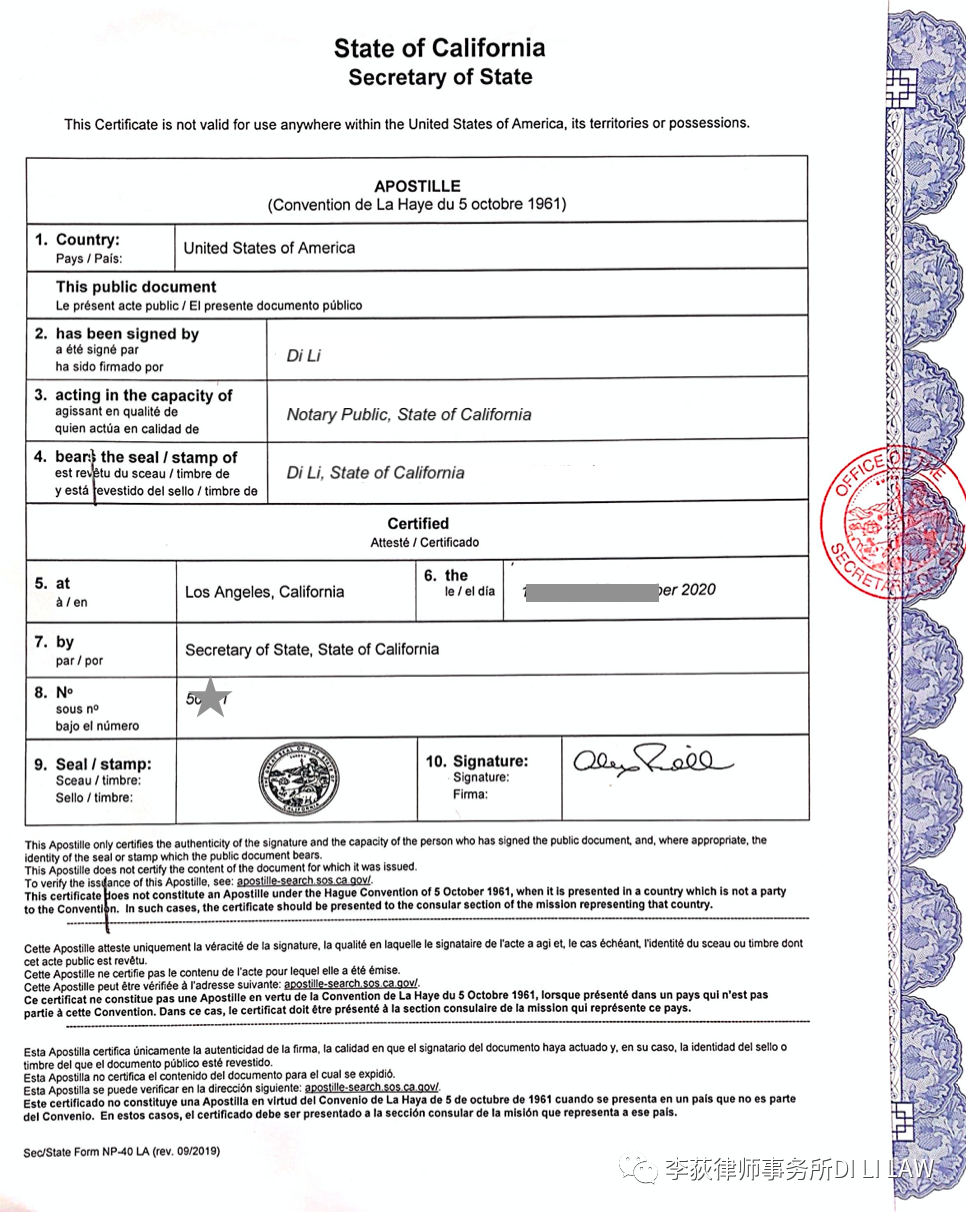 上图为加州州务卿 Secretary of State 海牙公证范本