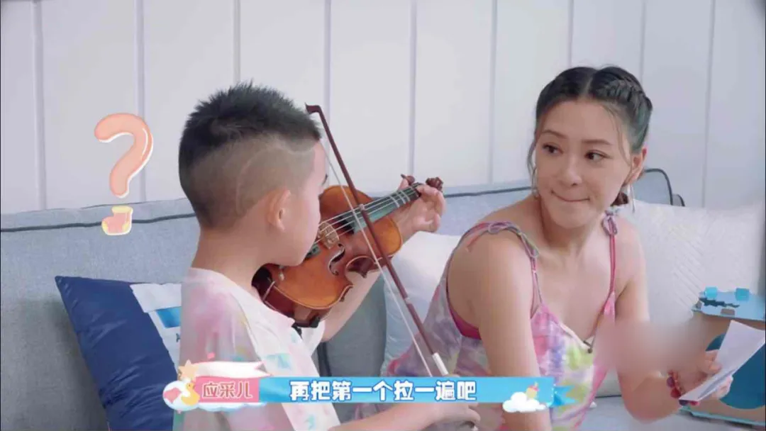 陈小春在一边不耐烦地看着儿子,一副“算了算了"的神情。但应采儿却按住了自己的急性子,对着曲谱,鼓励儿子再来一遍、再来一遍,眼神里写满了对儿子的肯定。