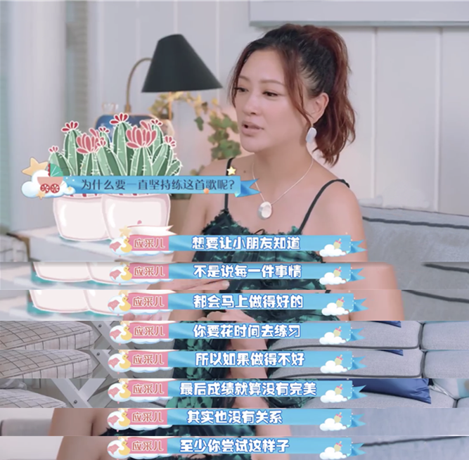 “想要让小朋友知道,不是每一件事情,都可以马上做得很好,你要花时间去练习。所以如果做得不好,最后成绩就算不完美也没有关系,至少你努力尝试了!”还是那档和朱丹同台的节目里,朱丹讲述了女儿才刚刚一岁时,带女儿去朋友家,弹了一下钢琴,朱丹就在旁边给女儿录了下来,把视频发给一个做音乐的朋友看,这个朋友看完说了句,“哎哟,你孩子真有天赋”。