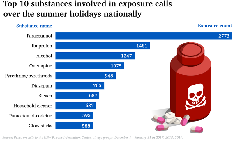 来自新州中毒信息中心的数据显示,该州有超过1560例扑热息痛的中毒病例,880例布洛芬中毒病例。