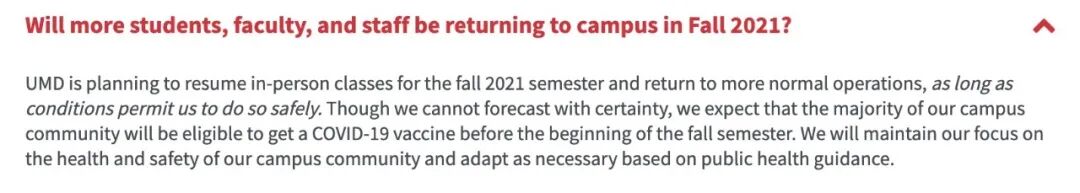 🍂 马里兰大学帕克分校预计,今年秋天应该会顺利开学,前提是学校能从FDA那里拿到新冠疫苗的使用权。如果校园社区的大多数人员在开学前都能接种疫苗,则今年秋季学期多少能恢复正常教学。校长达里尔·派恩斯(Darryll J. Pines)表示,专为面对面授课而设计的课程预计将于本秋季学期恢复,有些课程可能会继续线上线下混合模式,在特殊情况下某些员工可能会继续远程办公。