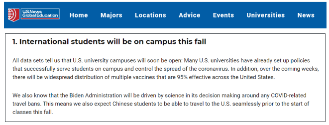 前不久,U.S.News Global Education主席Tom Dretler发布文章称 “国际生或将于今年秋季回归校园”,做出如此判断的理由有两点: