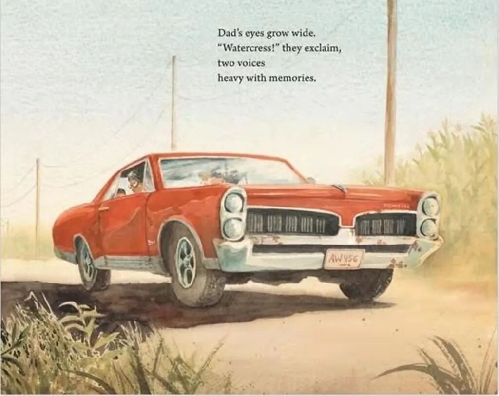 小女孩的父母开着一辆老式庞蒂克车穿过俄亥俄州,他们看到路边沟渠里野生的西洋菜时,突然停了下来。全家人拿上旧纸袋和生锈的剪刀,进入淤泥中,想要多摘一些沾满了泥土和蜗牛的西洋菜。