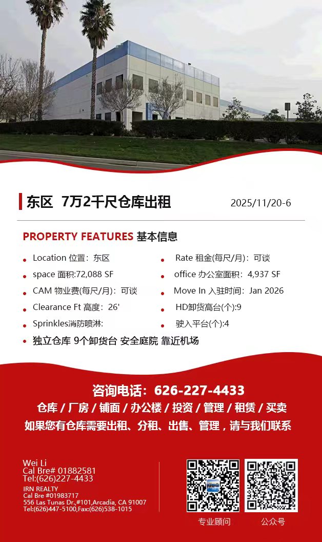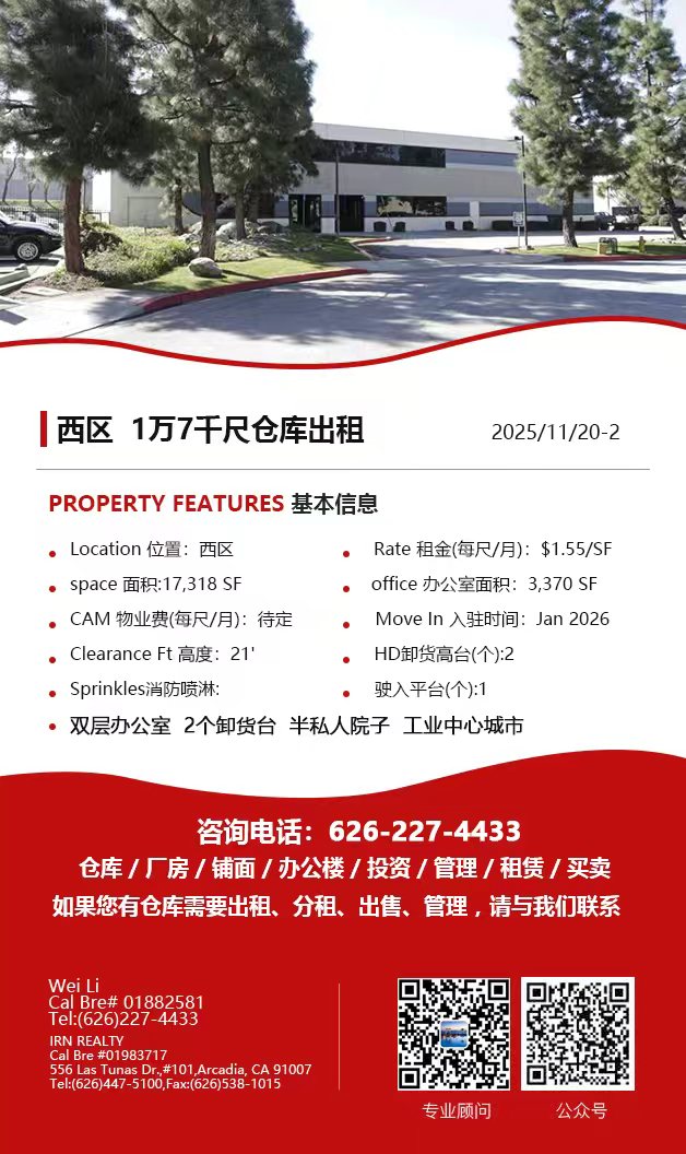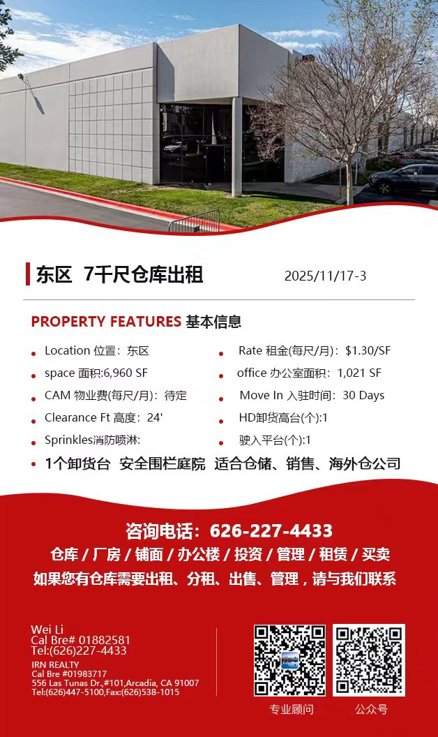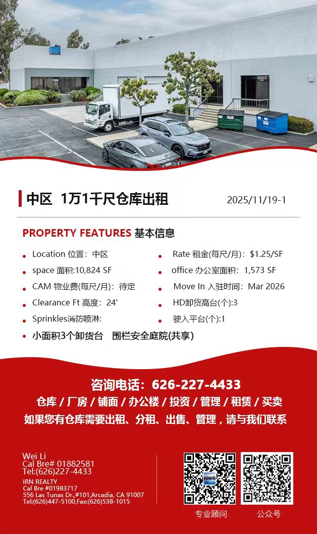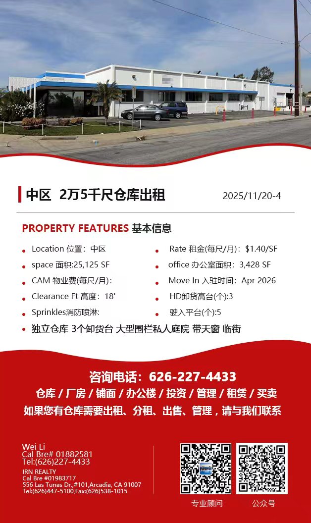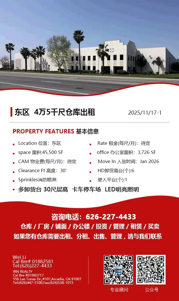 【仓库出租】Wei Li专业商业地产团队提供,11月20日,洛杉矶仓库出租更新,电话 626-227-4433,官网 www.51warehouse.com