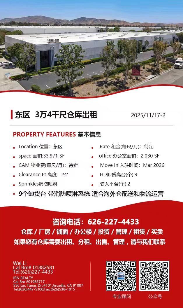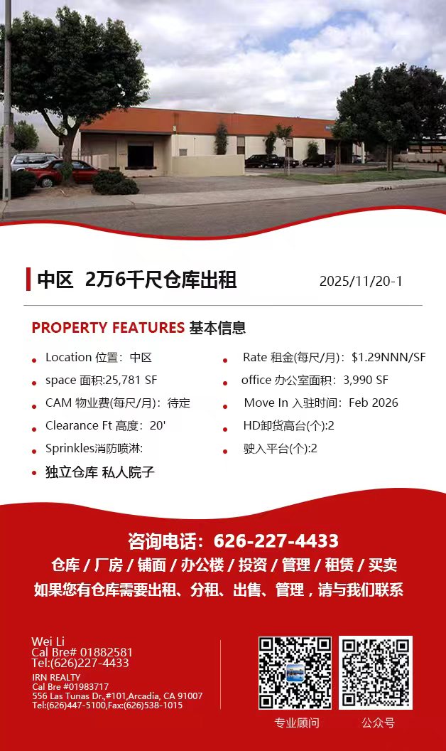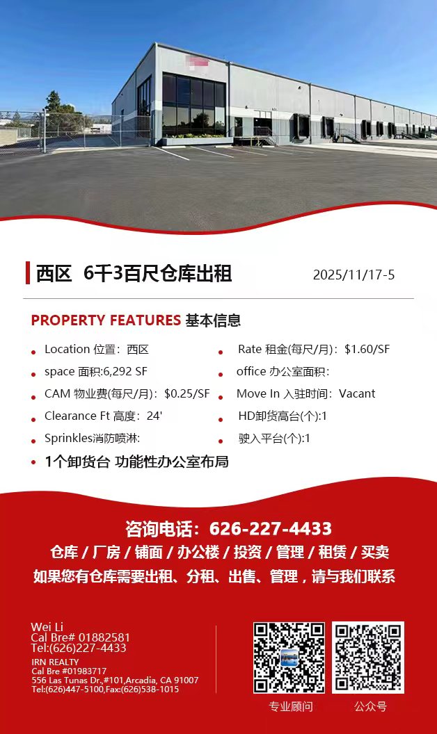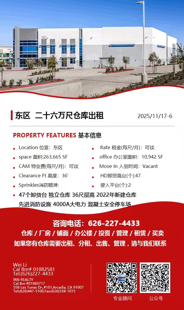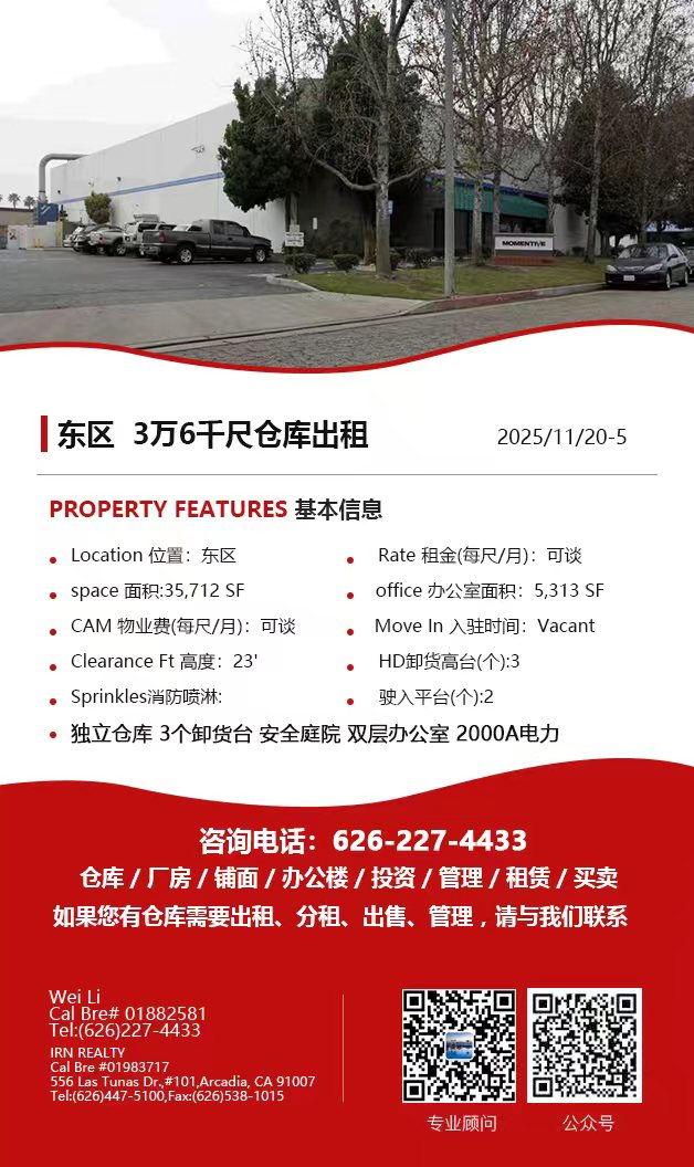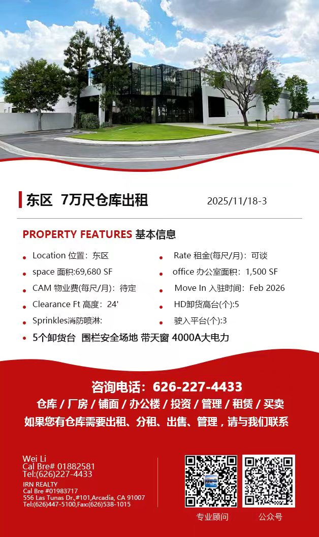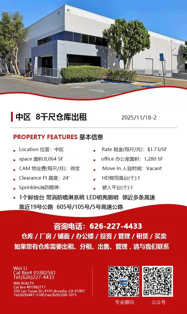 【仓库出租】Wei Li专业商业地产团队提供,11月20日,洛杉矶仓库出租更新,电话 626-227-4433,官网 www.51warehouse.com