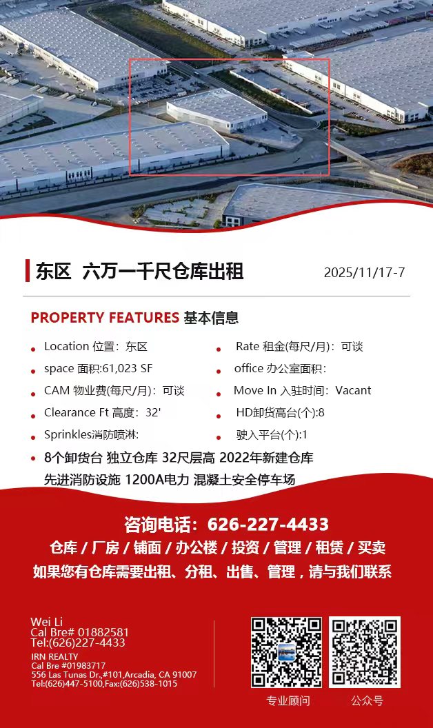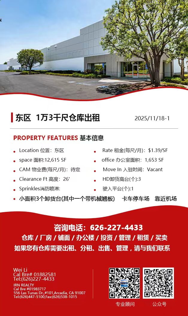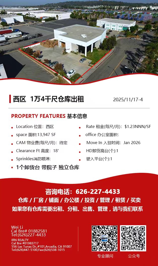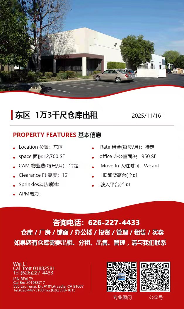 【仓库出租】Wei Li专业商业地产团队提供,11月13日,洛杉矶仓库出租更新,电话 626-227-4433,官网 www.51warehouse.com