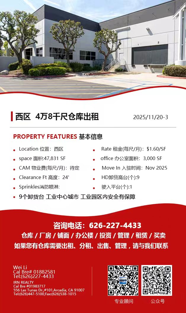 【仓库出租】Wei Li专业商业地产团队提供,10月09日,5万尺以下洛杉矶仓库出租更新,电话 626-227-4433,官网 www.51warehouse.com