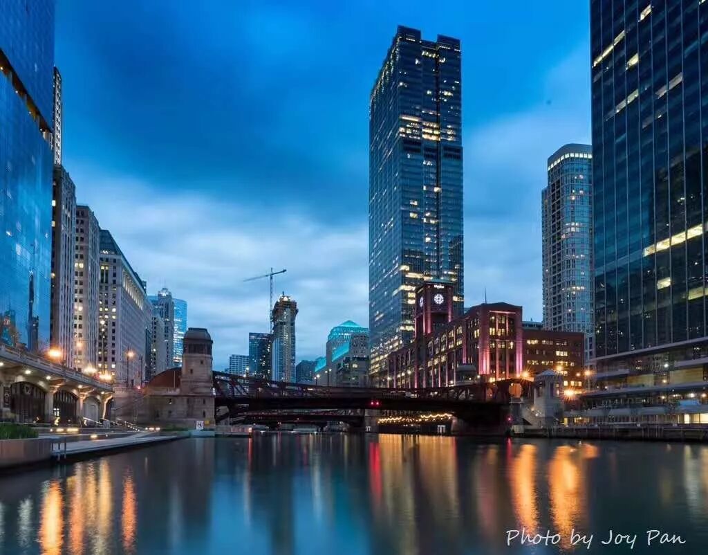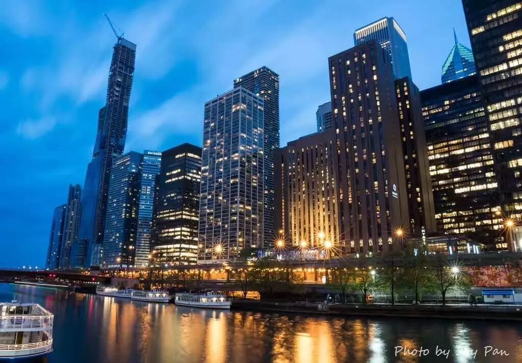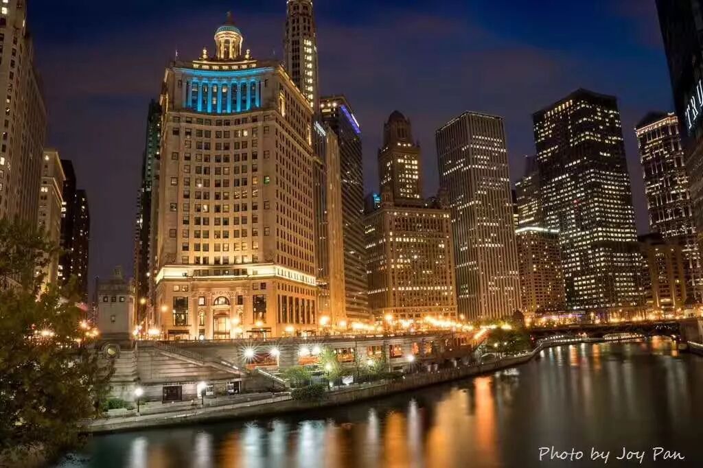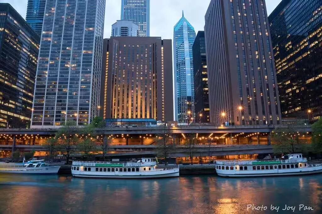 两张手机照。记录芝加哥魅力无穷的河岸夜景。