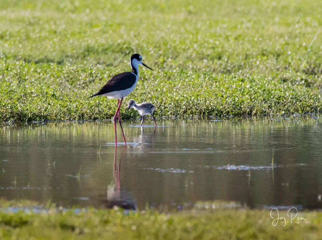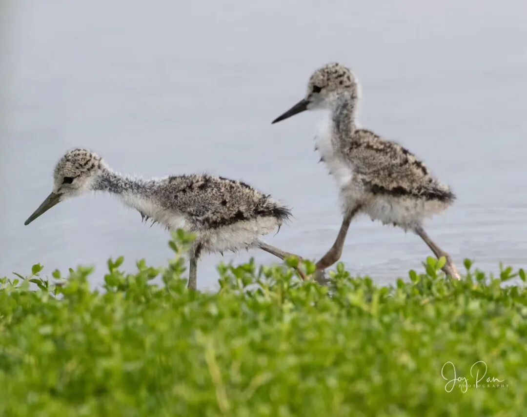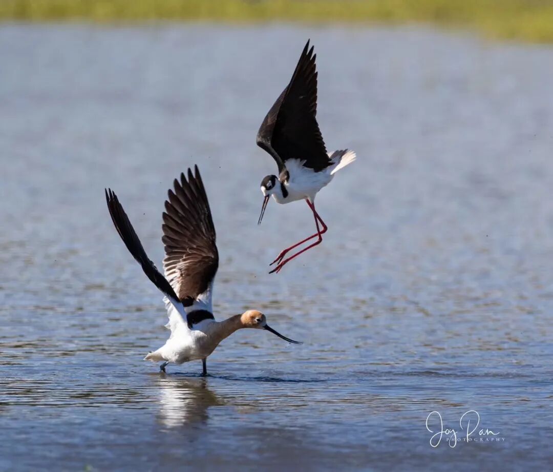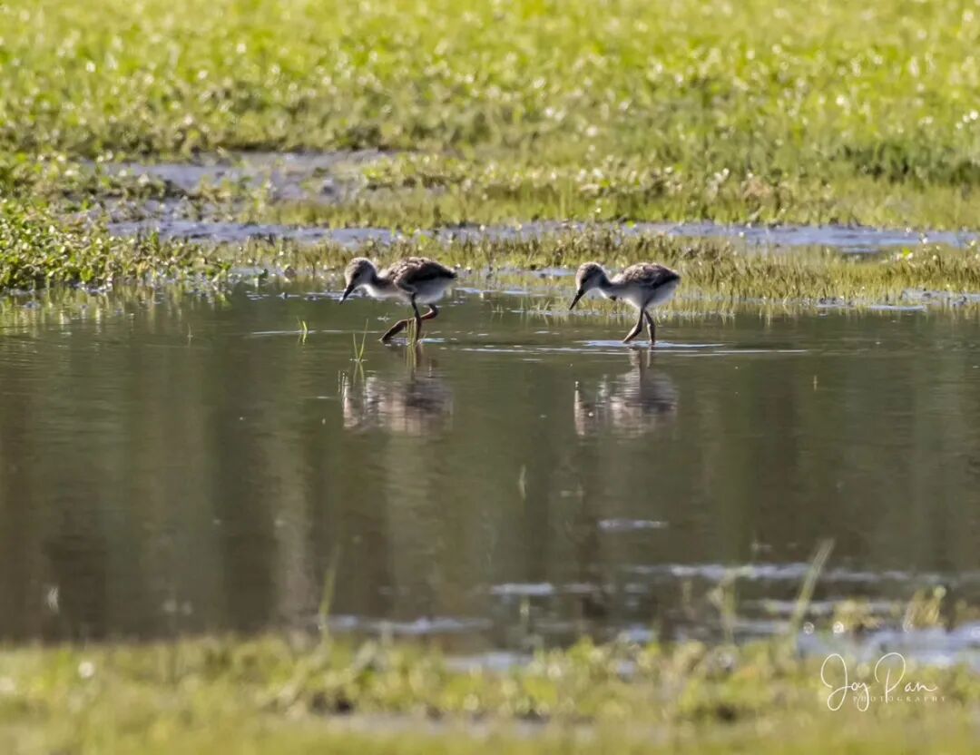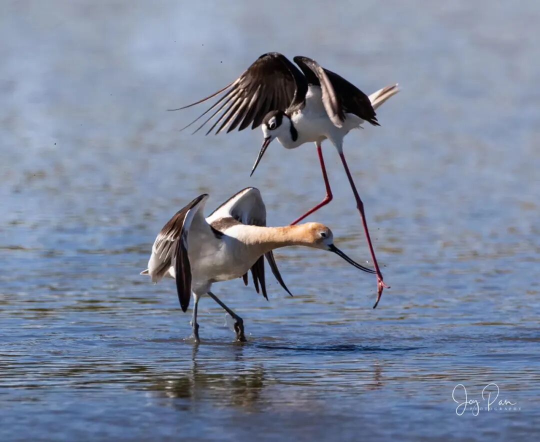 这一天的拍摄主题是湖边家庭保卫战。Stilt(长脚鹬)的体型明显比Avocet细小很多,却多次公然挑衅Avocet,后者一直处于被动状态。这是为什么呢?我百思不得其解。后来经过仔细观察,才发现个中缘由,原来,有几只长脚鹬Baby正在水边学步。鸟爸鸟妈可能觉得反嘴鹬兵临城下或将要威胁到Baby,于是主动出击,警告它们离宝宝远一点!父爱如山,为母则刚,人同此心,鸟通此理。护犊之心,勇气倍增,以卵击石,以小搏大,在所不惜。