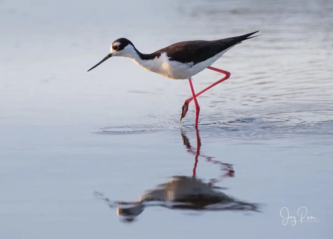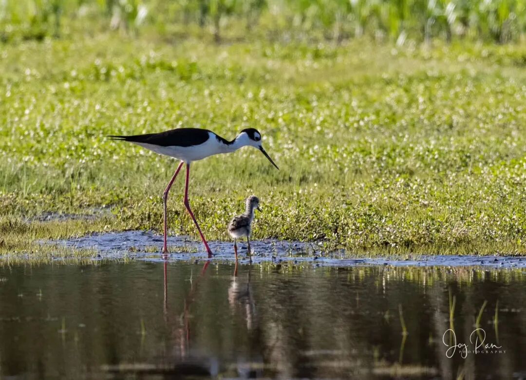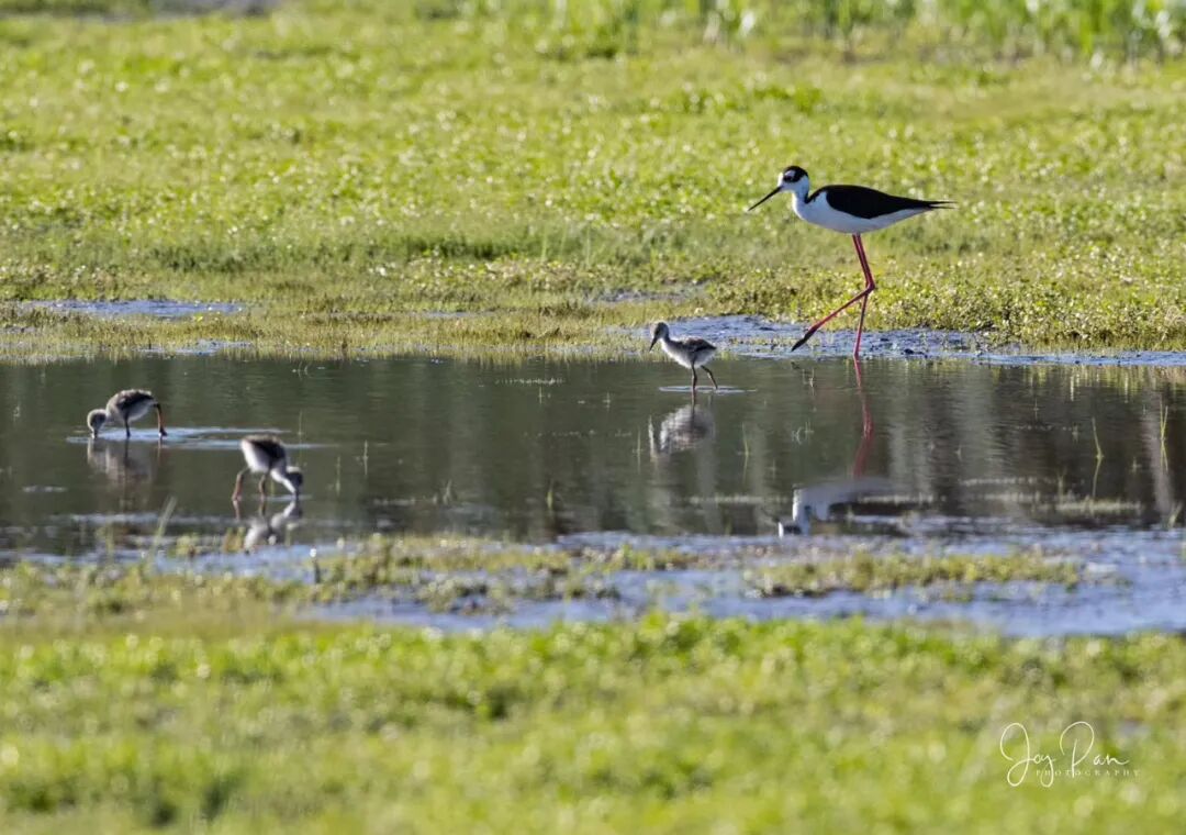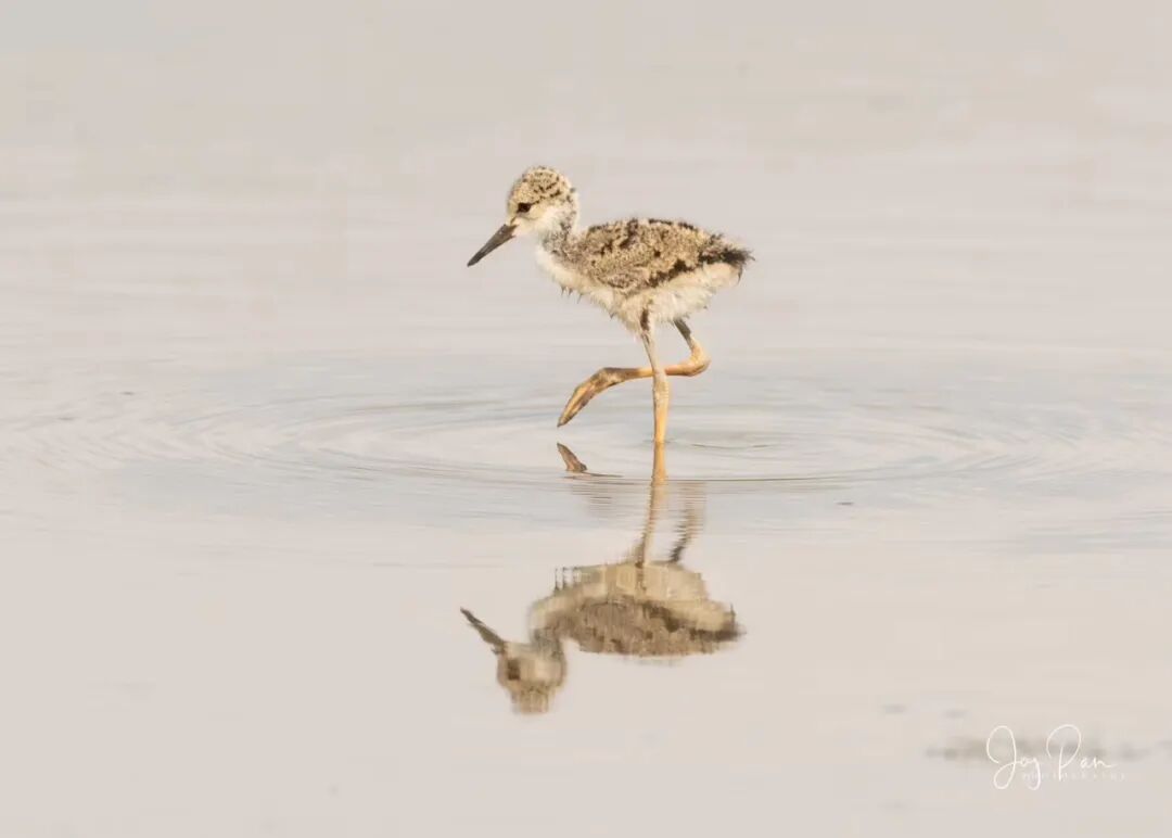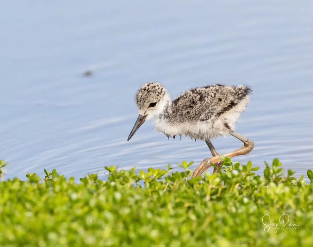 这一天的拍摄主题是湖边家庭保卫战。Stilt(长脚鹬)的体型明显比Avocet细小很多,却多次公然挑衅Avocet,后者一直处于被动状态。这是为什么呢?我百思不得其解。后来经过仔细观察,才发现个中缘由,原来,有几只长脚鹬Baby正在水边学步。鸟爸鸟妈可能觉得反嘴鹬兵临城下或将要威胁到Baby,于是主动出击,警告它们离宝宝远一点!父爱如山,为母则刚,人同此心,鸟通此理。护犊之心,勇气倍增,以卵击石,以小搏大,在所不惜。