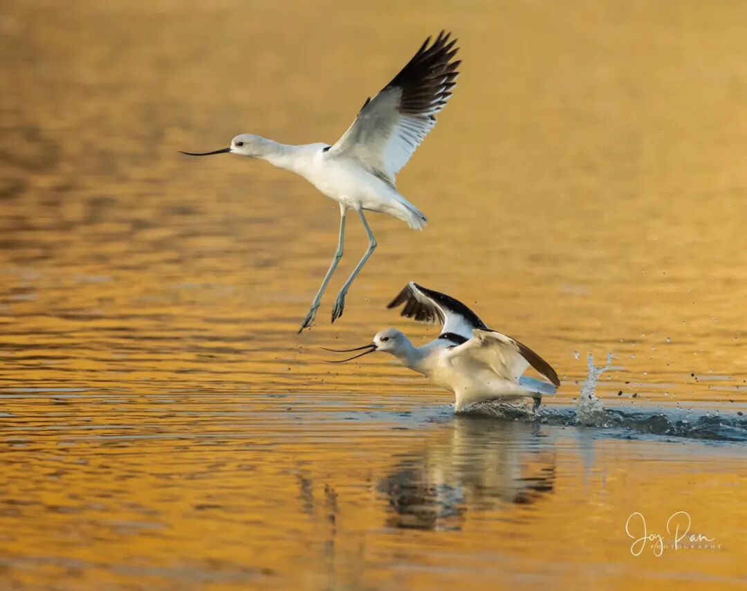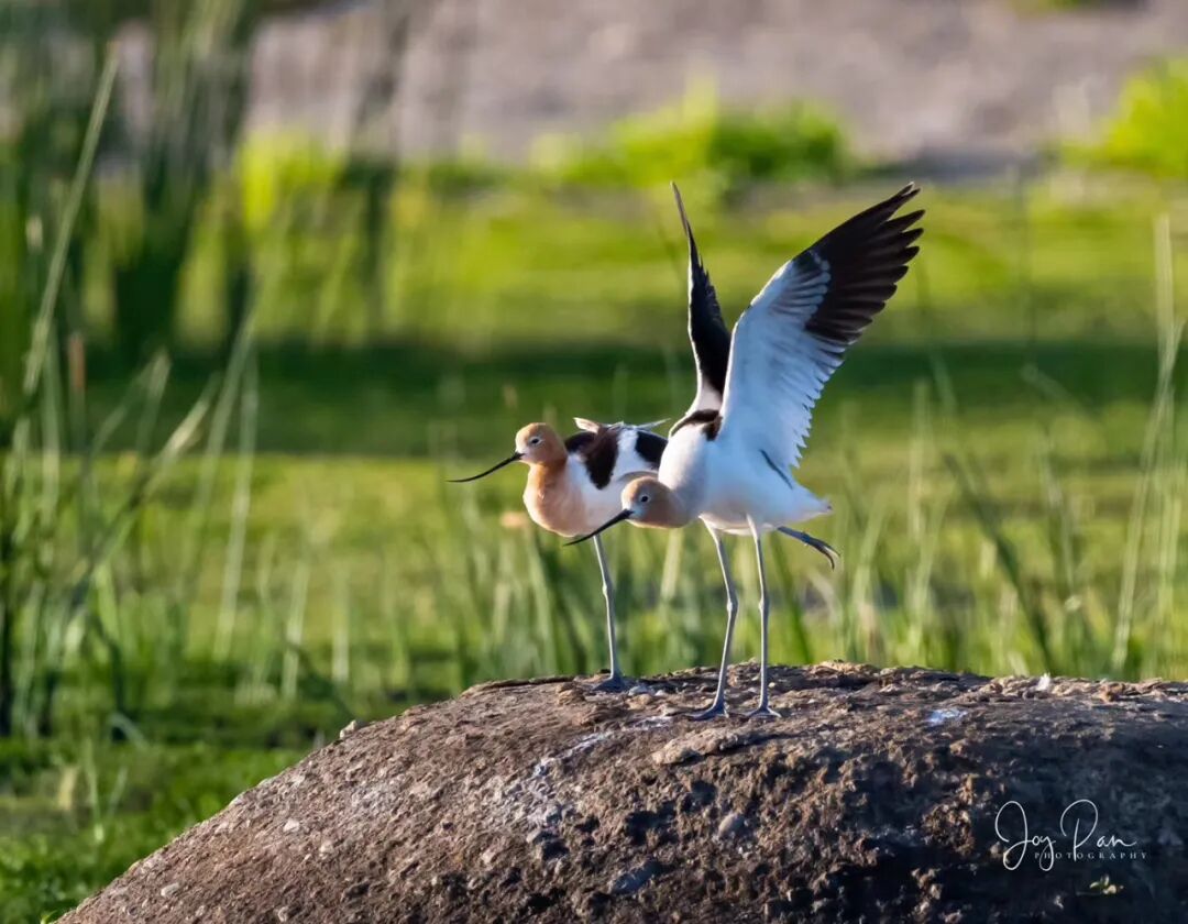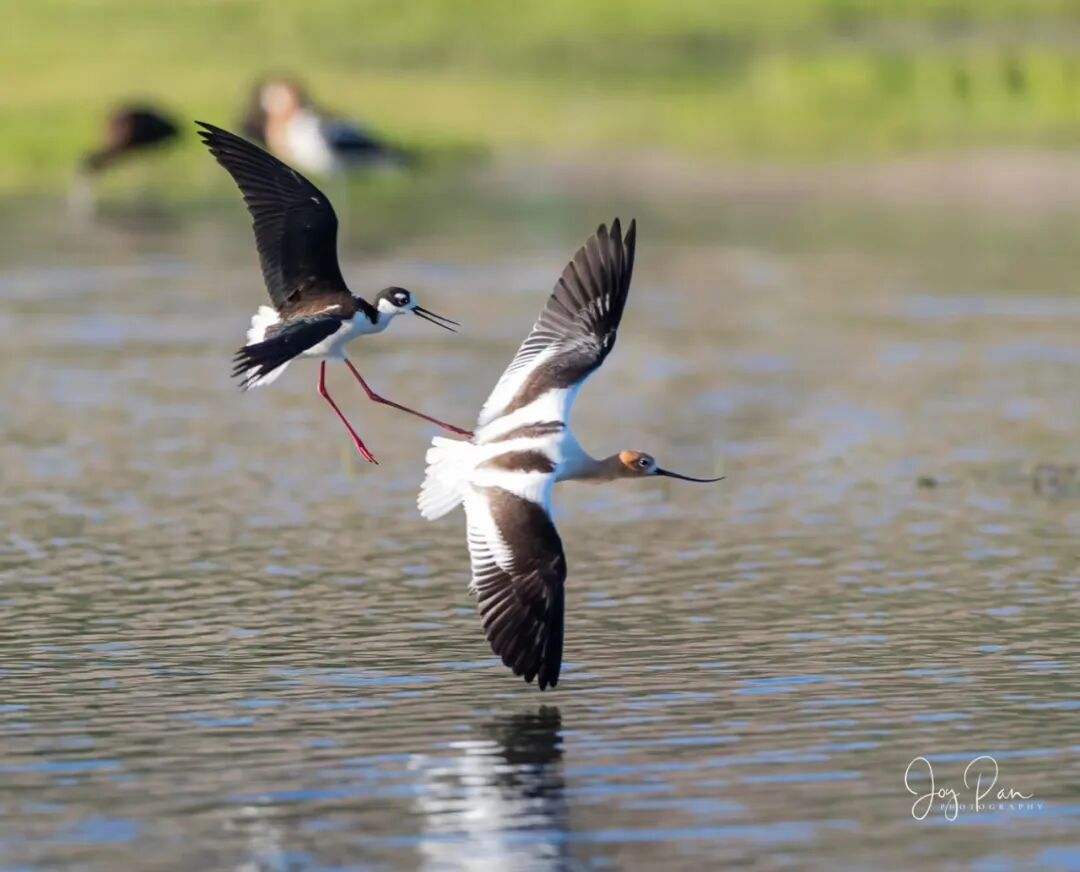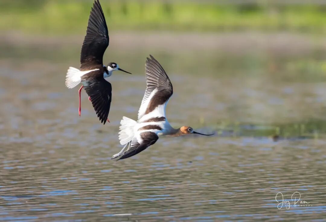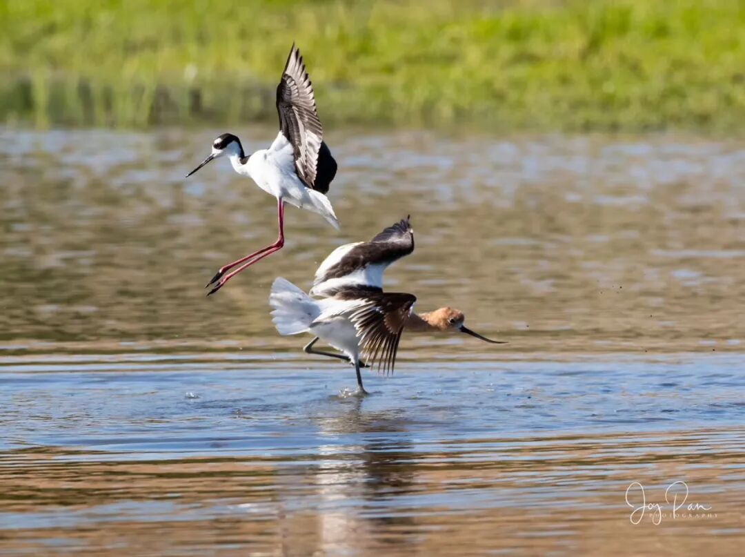 湿地里有两种从外形、色泽到性格都大不同的反嘴鹬,黑色的长脚鹬(black stilt)比较好动好斗,棕黄色的avocet稍微安静端庄些,它们两小伙儿偶尔会起冲突,可是我竟然有幸拍到这两种鹬打完架后,比翼双飞的画面,也许它们前世是不记仇的欢喜冤家吧。