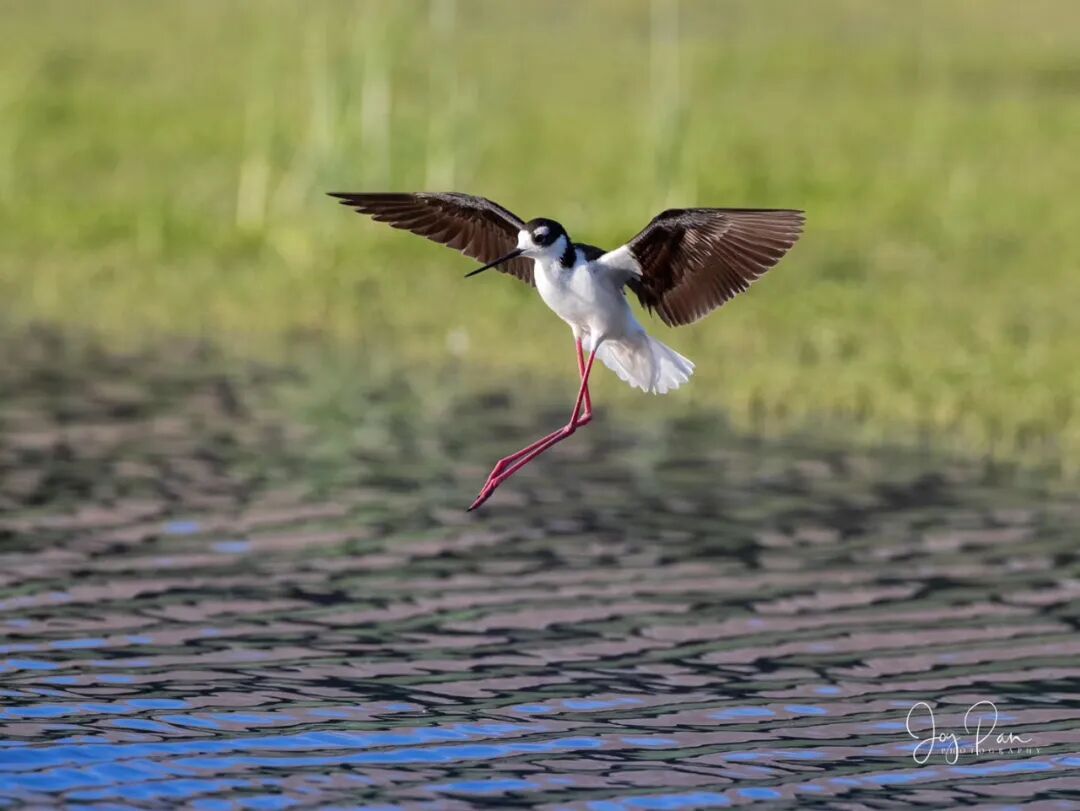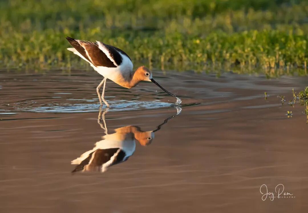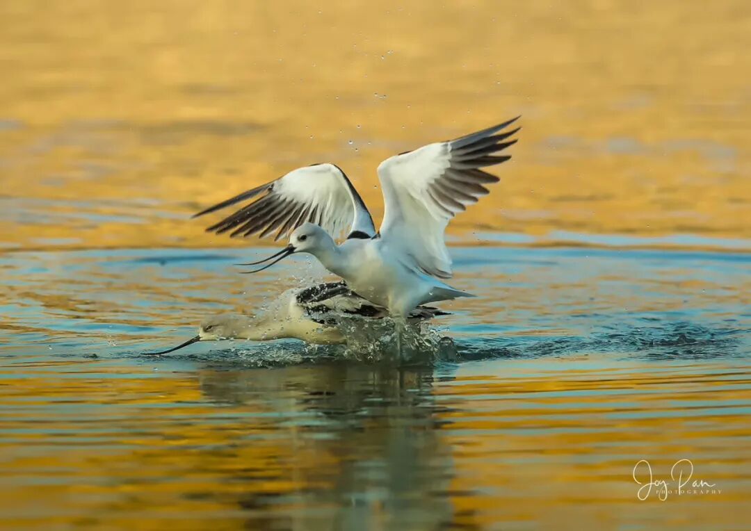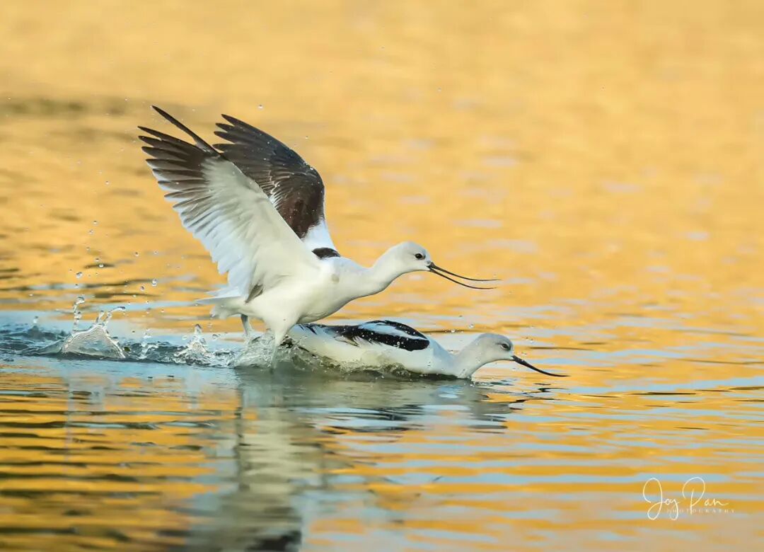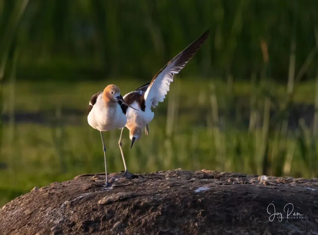 湿地里有两种从外形、色泽到性格都大不同的反嘴鹬,黑色的长脚鹬(black stilt)比较好动好斗,棕黄色的avocet稍微安静端庄些,它们两小伙儿偶尔会起冲突,可是我竟然有幸拍到这两种鹬打完架后,比翼双飞的画面,也许它们前世是不记仇的欢喜冤家吧。
