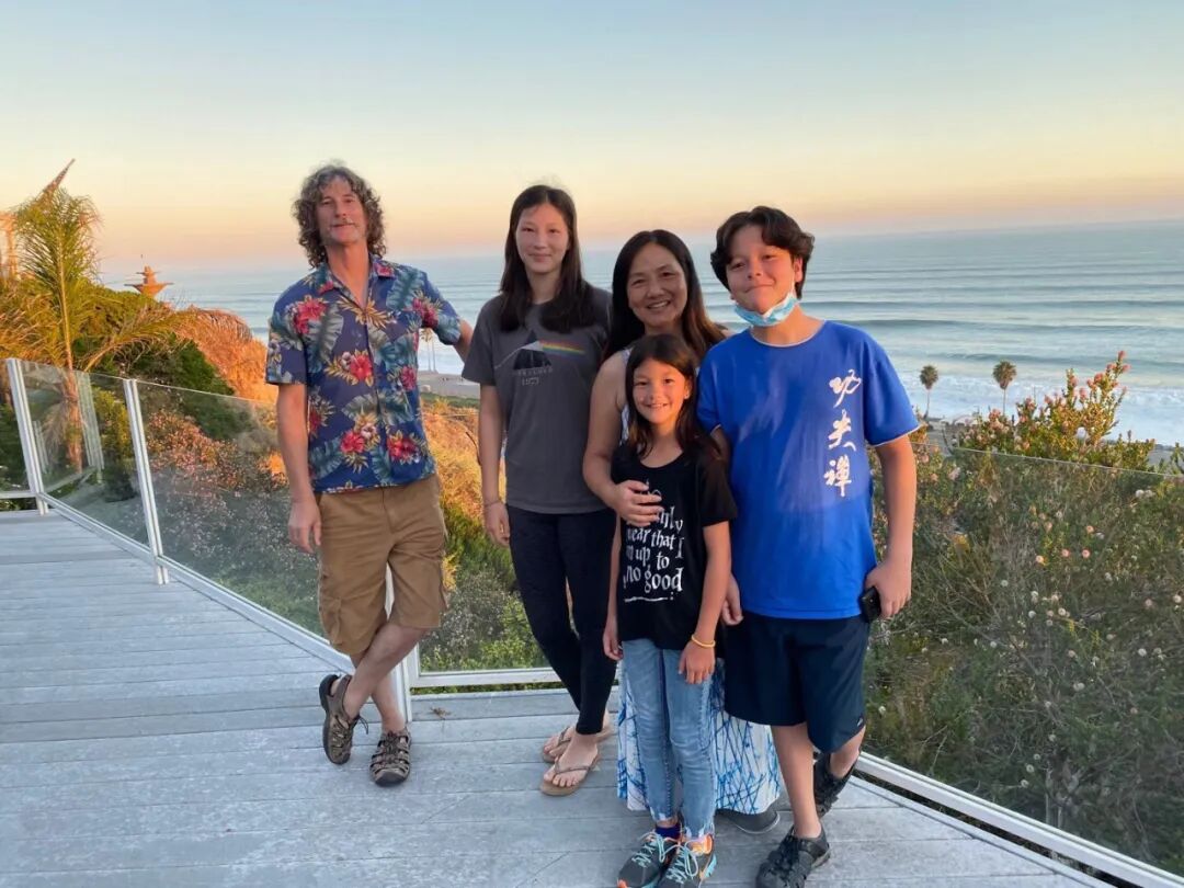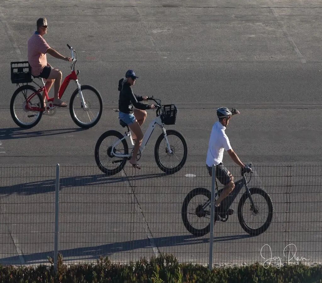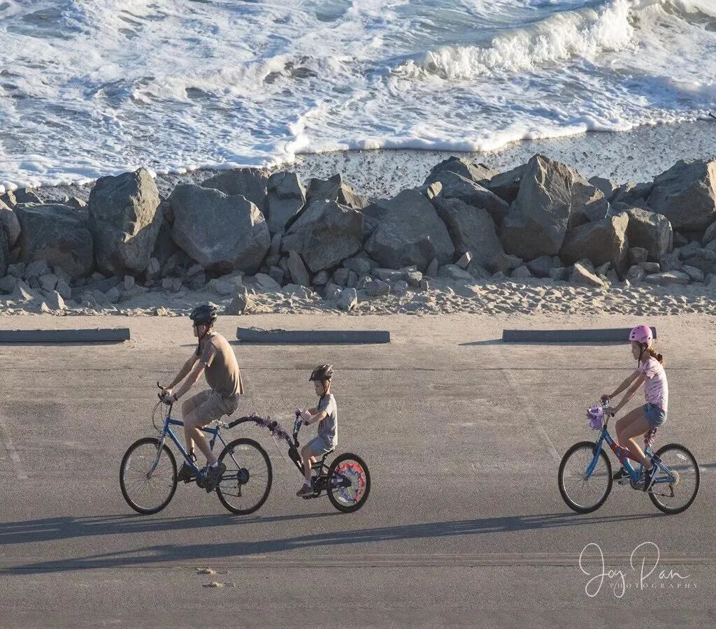等他们骑单车回来,我们全家坐在阳台上看着过往骑车人,很像以前在繁华闹市欣赏美女帅锅,养眼、悦目。难为那些去冲浪的人,偌大的冲浪板要用自行车驮到海滩,还要原路驮回去。更有甚者要用头顶着冲浪板回家。