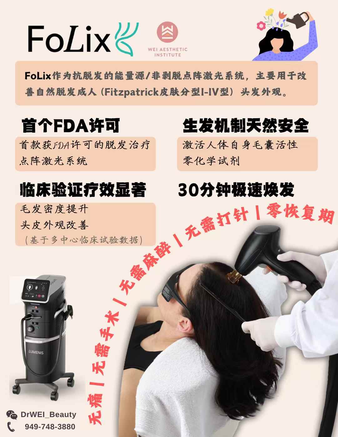 對於脫髮較為嚴重或持續時間較長的產後媽媽,可以考慮專業的醫療級生髮治療。魏醫師診所引進的FoLix鐳射激光生髮技術,運用點陣激光技術,用科技喚醒毛囊活性,對產後脫髮效果顯著: