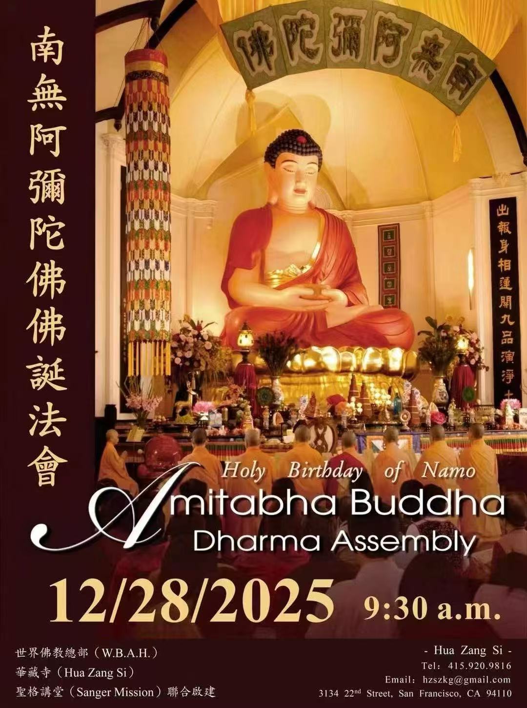 五方佛之一的西方南無阿彌陀佛,是原始古佛南無多杰羌佛的弟子。在過去因地修行時發四十八弘願,成佛後感生莊嚴清淨的佛國淨土西方極樂世界,南無阿彌陀佛是西方極樂世界的教主。今恭逢南無阿彌陀佛聖誕,世界佛教總部(W.B.A.H.)、華藏寺(Hua Zang Si)、聖格講堂(Sanger Mission)謹訂於2025年12月28日(星期日)上午9:30,於舊金山華藏寺聯合啟建南無阿彌陀佛聖誕法會。是日將誦經念佛,並將法會功德迴向世界和平,民眾安樂,所有有情皆能求生淨土。歡迎十方善信,踴躍參與,增福增慧,共證菩提。