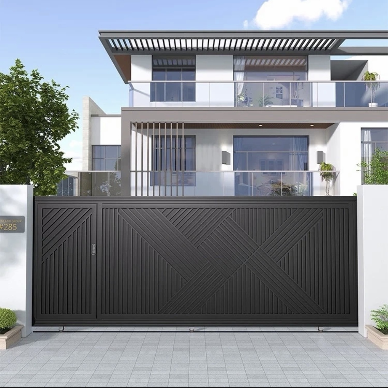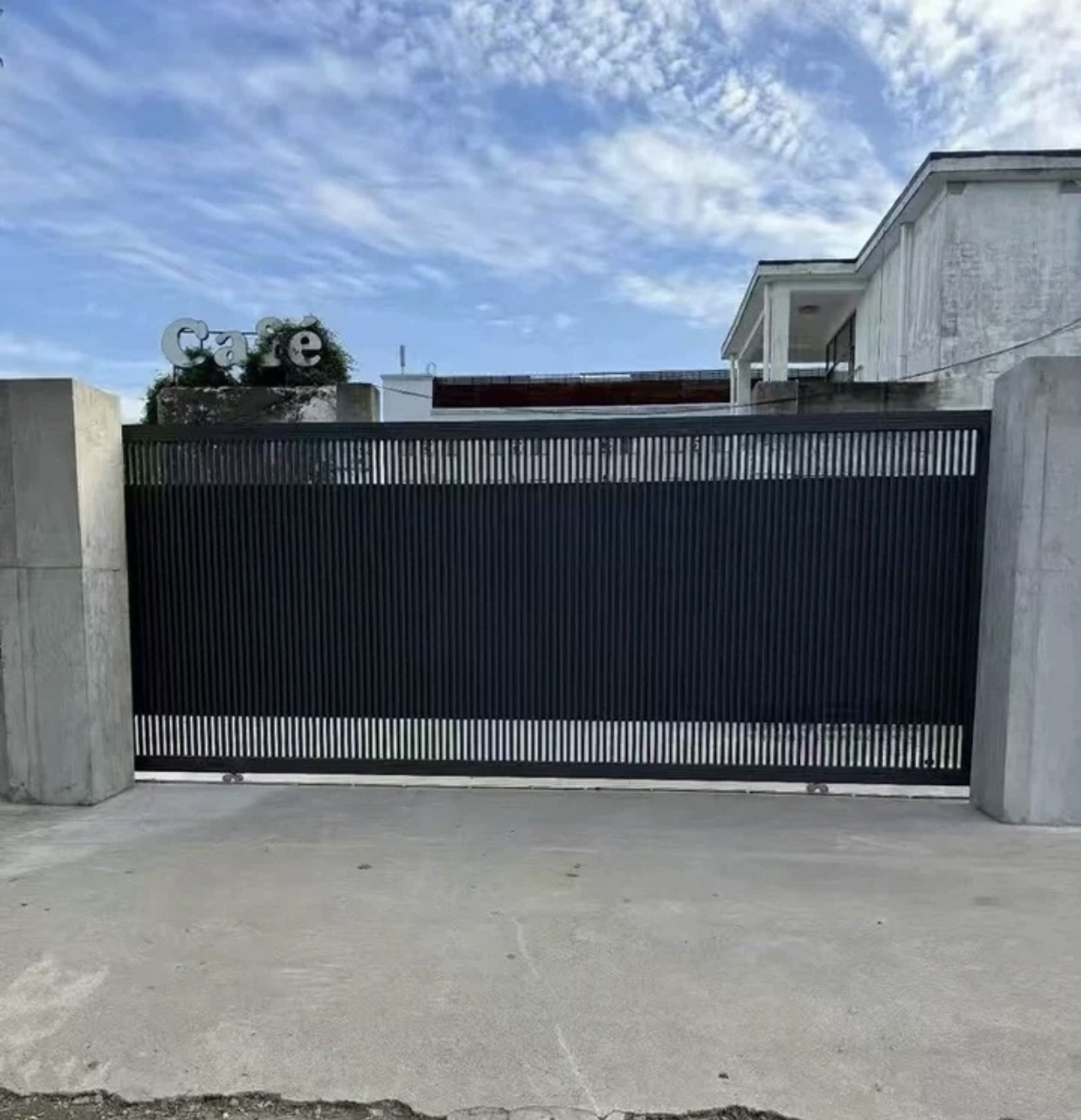 本案採用橫向滑動式大型鐵製大門,整體以現代極簡風格為主軸,運用細緻的直條排列設計,在兼顧隱私與通風採光的同時,也展現出層次分明的視覺效果。黑色粉體烤漆處理,不僅質感沉穩大方,更具備優良的防鏽與耐候性能,適合長期戶外使用。