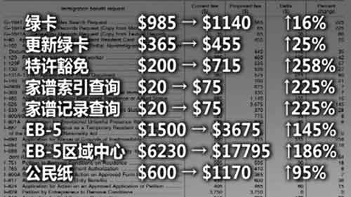 移民局的個別項目新收費,包括申請綠卡者,費用將從985美元提高到1140美元,增幅約10%;更新綠卡將增加90美元,從365美元上升到455美美元;申請重發公民紙從345美元提高到555美元,而公民父母替孩子申請公民紙,費用從現行600美元,大幅提高到1170美元。