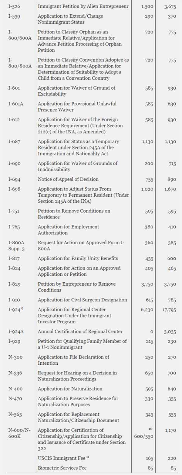 即將施行的收費標準中,投資移民方面的費用也大幅調漲,其中申請成立區域中心的費用,從現行的6230美元,提高到1萬7795美元,增幅達186%,而公告中也特別説明,以往區域中心每年都需要取得的認證,一直是免費核發,不過從12月23日起開始收費,將新收取3035美元。此外,投資移民申請I-526簽證的費用,也從現行1500美元,調高到3675美元。