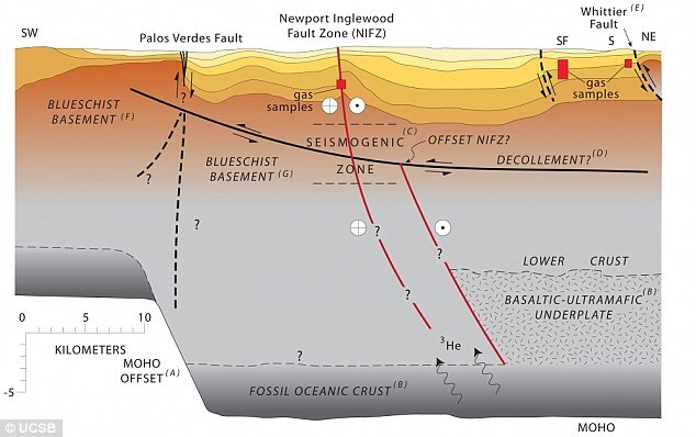"大約3000萬年前,太平洋板塊與北美板塊碰撞,在紐波特-英格伍德斷裂帶創造了一個俯衝帶。"博爾斯解釋道。 "然後,出於某種原因交界處移到目前聖安德烈亞斯斷層處,儘管這究竟是如何發生的仍是未知數。這篇文章展示了紐波特-英格伍德斷裂帶地幔處的洩露比聖安德烈亞斯斷層的更多,這是一個新發現。"這項發現與一個科學假設相矛盾,後者認為在洛杉磯盆地表面下方存在一個主要的脫頂褶皺,後者是一個緩傾的逆衝斷層。 "我們發現紐波特-英格伍德斷裂帶不僅非常深,且直接或者間接的與地幔相連。"