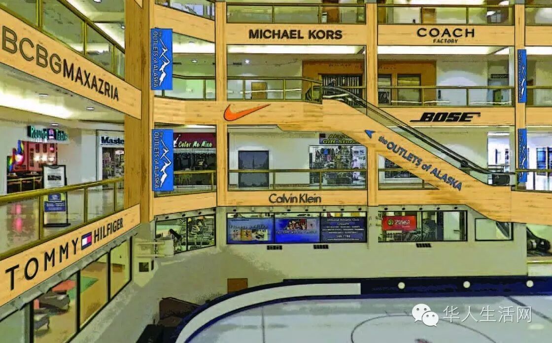 阿拉斯加有一家高档购物中心叫Anchorage 5th Avenue Mall,有5层楼,含有Apple, Coach, Sephora等110家店,还有当地特色的Alaska Wild Berry Products(里面有各种巧克力、巧克力喷泉)。