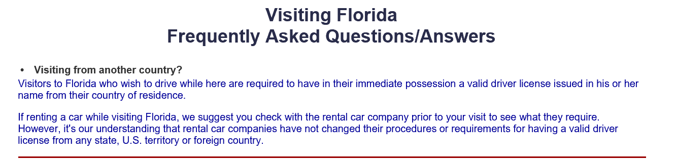 "在佛罗里达, 游客希望自己驾车的话需要拥有本国为其居民颁发的有其姓名的有效驾照。"