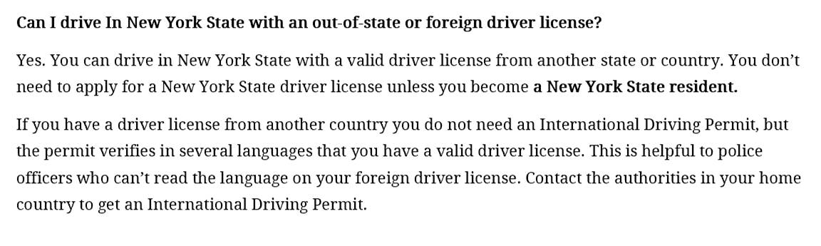 问题:我在纽约州是否可以持外州驾照和外国驾照开车?