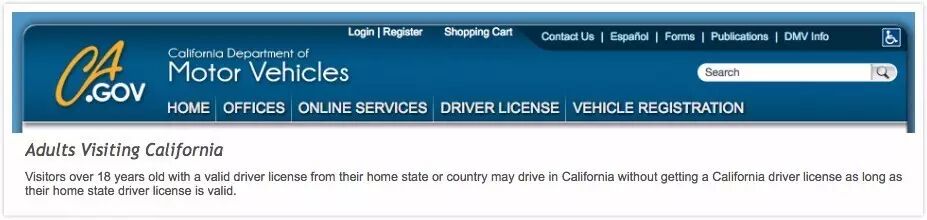 加州DMV明文规定:超过18岁的来加州旅游的访客,即使没有美国驾照的前提,依然在加州可以合法开车。只要他们所持的本国驾照在合法有效期内!