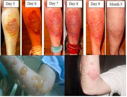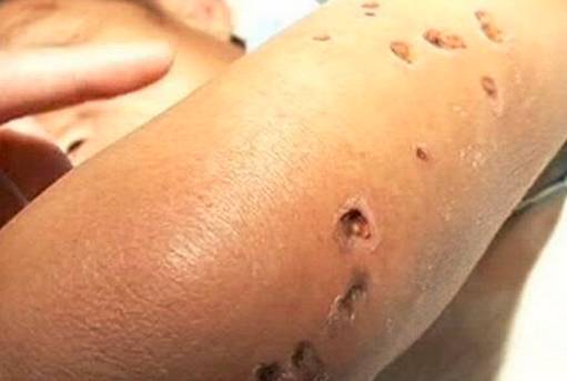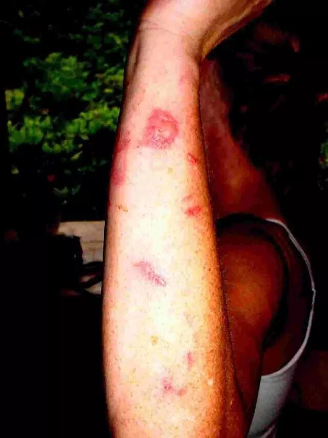 这些伤口会出现对阳光过敏的反应,快的话15分钟就会长出水泡,还会留疤(少则几个月,长达六年)!