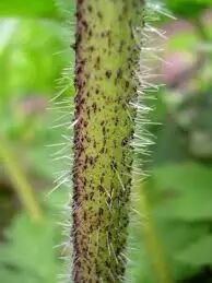 茎是绿色的,长着大片紫色斑点和白色纤维。