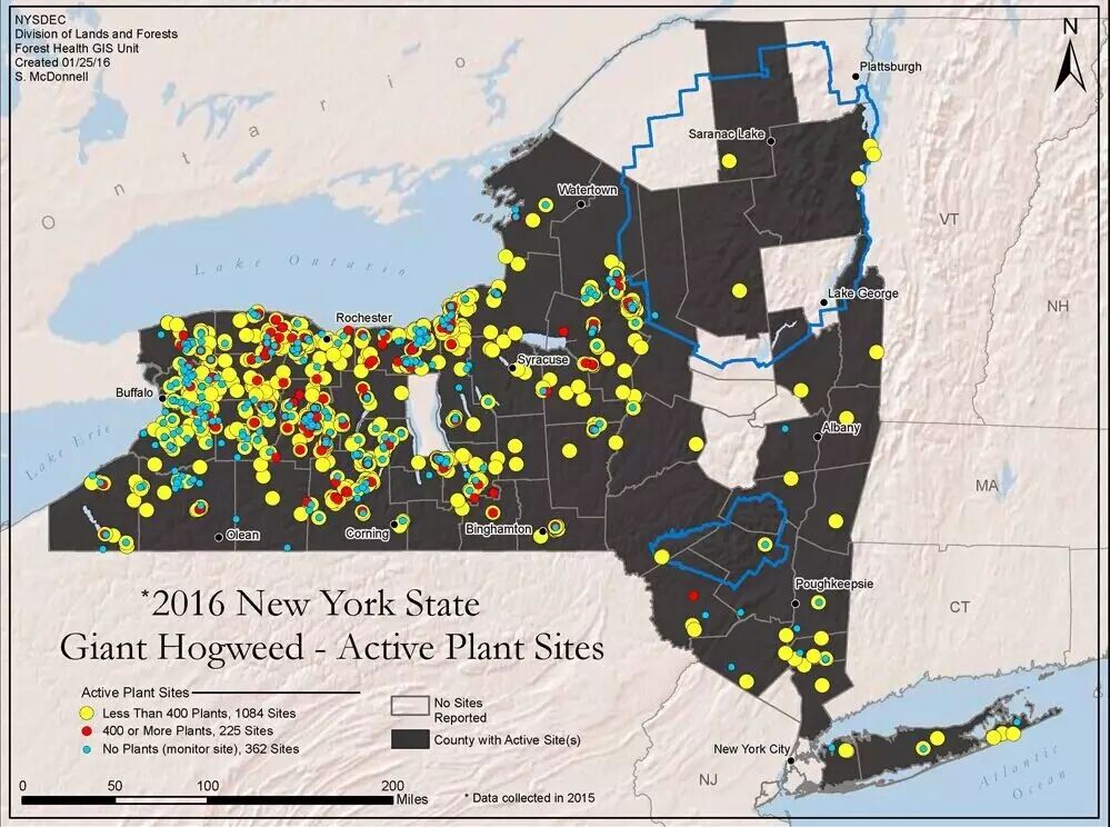 这种危险的植物在美国的各州威胁着民众和游客的生命健康。仅在纽约州它的分布就十分吓人。。。
