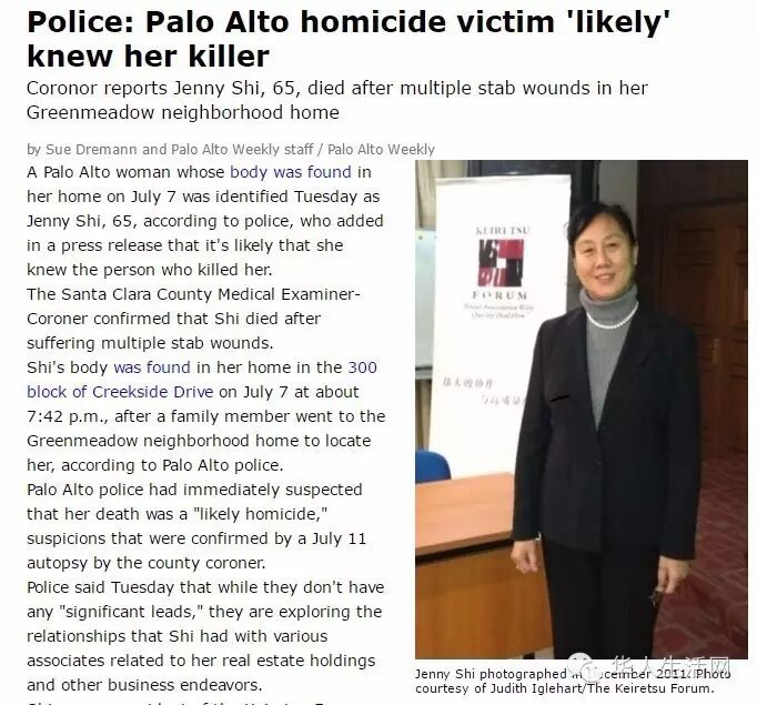 据《圣荷西水星报》7月13日报导,圣克拉拉县法医表示,验尸官办公室在尸检后发现,女针灸师石珍妮(Jenny Shi)死于多处刀伤。