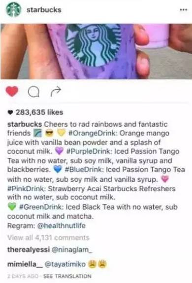 星巴克还慷慨的在官网公布了这五款饮品的配方,所用材料都是比较常见的,所以包括国内的星巴克也可以调出彩虹杯。