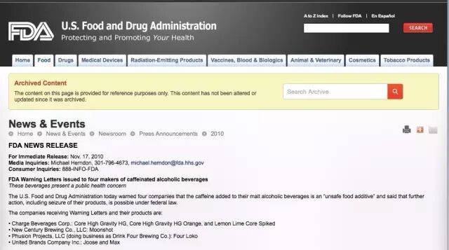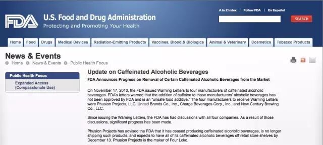FDA官网上贴出了制造商Phusion Projects宣布暂停出售含有咖啡因的FOUR LOKO的消息。