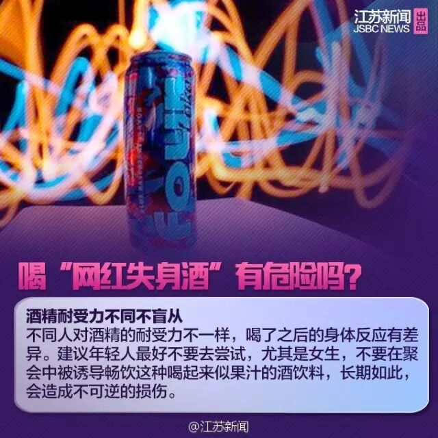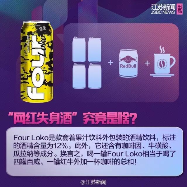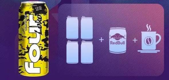 简单来说,尽管这款FOUR LOKO的包装、口感都像果汁,但其标注的酒精含量12%很高。据其官方微博信息,喝一罐695ml的这种酒,其效果相当于喝半打啤酒(或5杯45°纯威士忌或5杯红酒)。