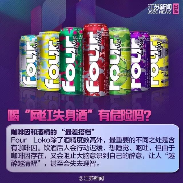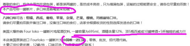 不过,淘宝等网购平台上售卖的FOUR LOKO鱼龙混杂,有些销仍是原配方(含有咖啡因)的版本也很有可能混在不含咖啡因的版本里销售给消费者。