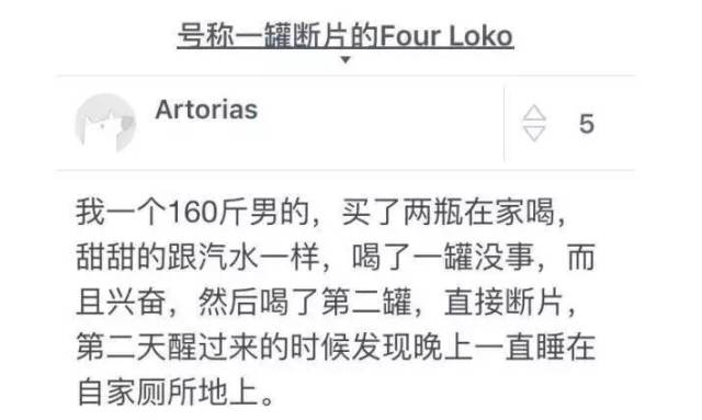 然而,该酒除咖啡因外,还含有牛磺酸、瓜拉纳等成分。也就是说:一罐FOUR LOKO相当于四罐百威、一罐红牛外加一杯咖啡的总和!所以,一罐FOUR LOKO基本可以放倒所有人!而且让你越醉越兴奋,最后直接断片!