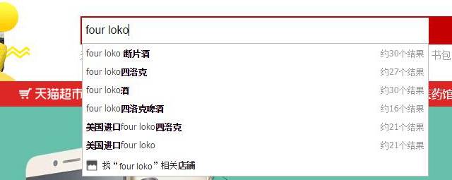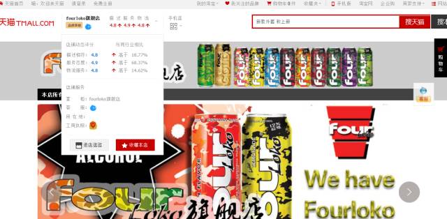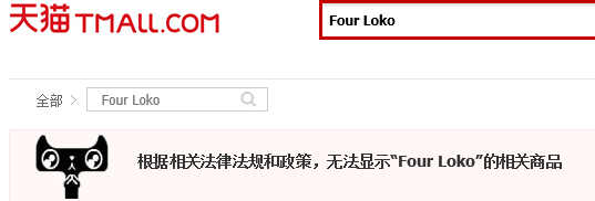 此外,名为“FOUR LOKO旗舰店”的天猫店铺也在今年六七月份投入运营。然而,当记者在天猫商城输入“FOUR LOKO”时,下拉列表中出现了一系列如“Four LOKO断片酒”等搜索引导词。但奇怪的是,当记者点击搜索“FOUR LOKO”后,天猫商城页面却显示为“根据相关法律法规和政策,无法显示……”
