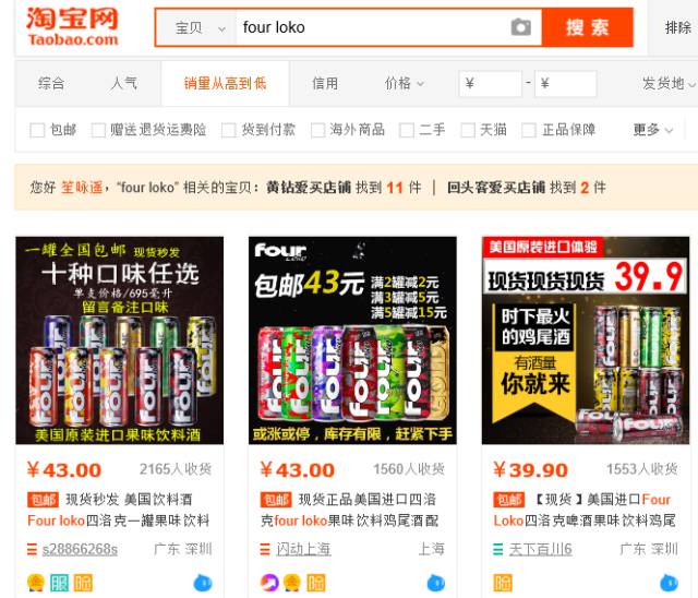 然而,记者通过淘宝搜索却能搜到包含“FOUR LOKO旗舰店”在内的大批结果,发现多家商铺仍在销售FOUR LOKO且销量可观。